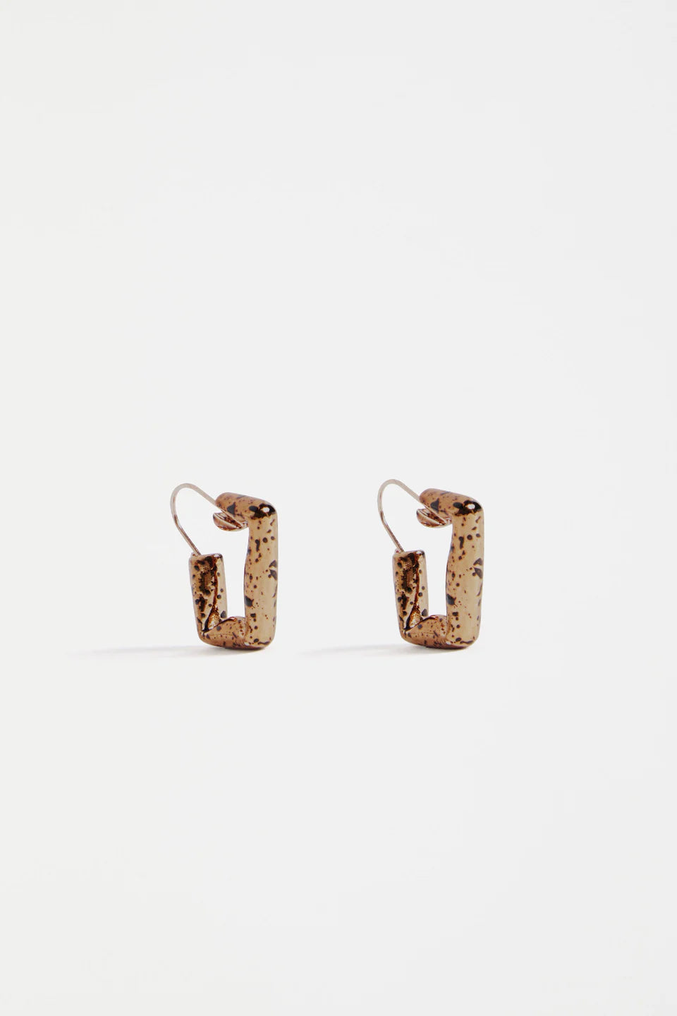 Small sculptural square Hoops with inbuilt backing to allow for easy wear -interesting Anodised base with contrasting shiny enamel paint splatter effect -Lightweight style