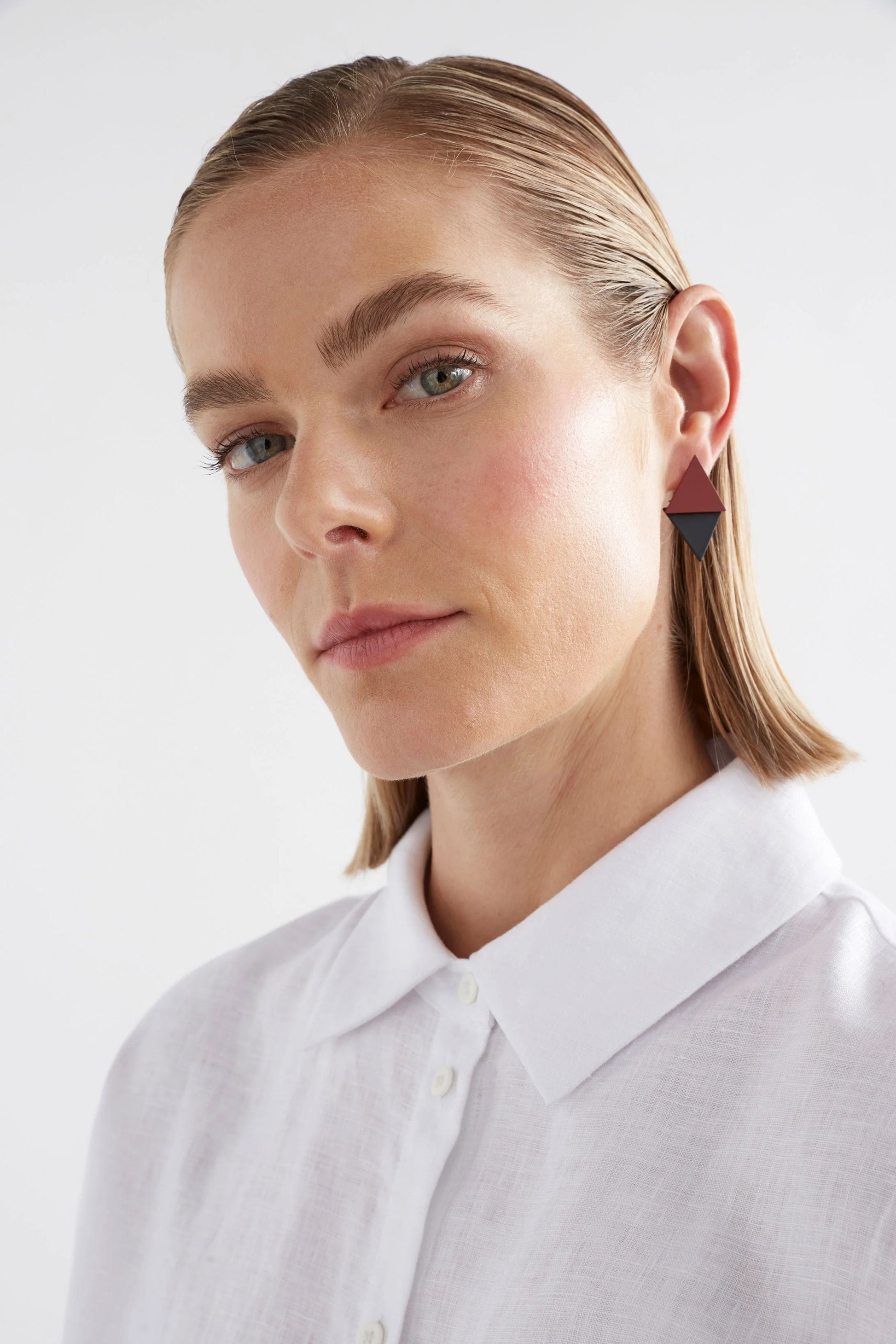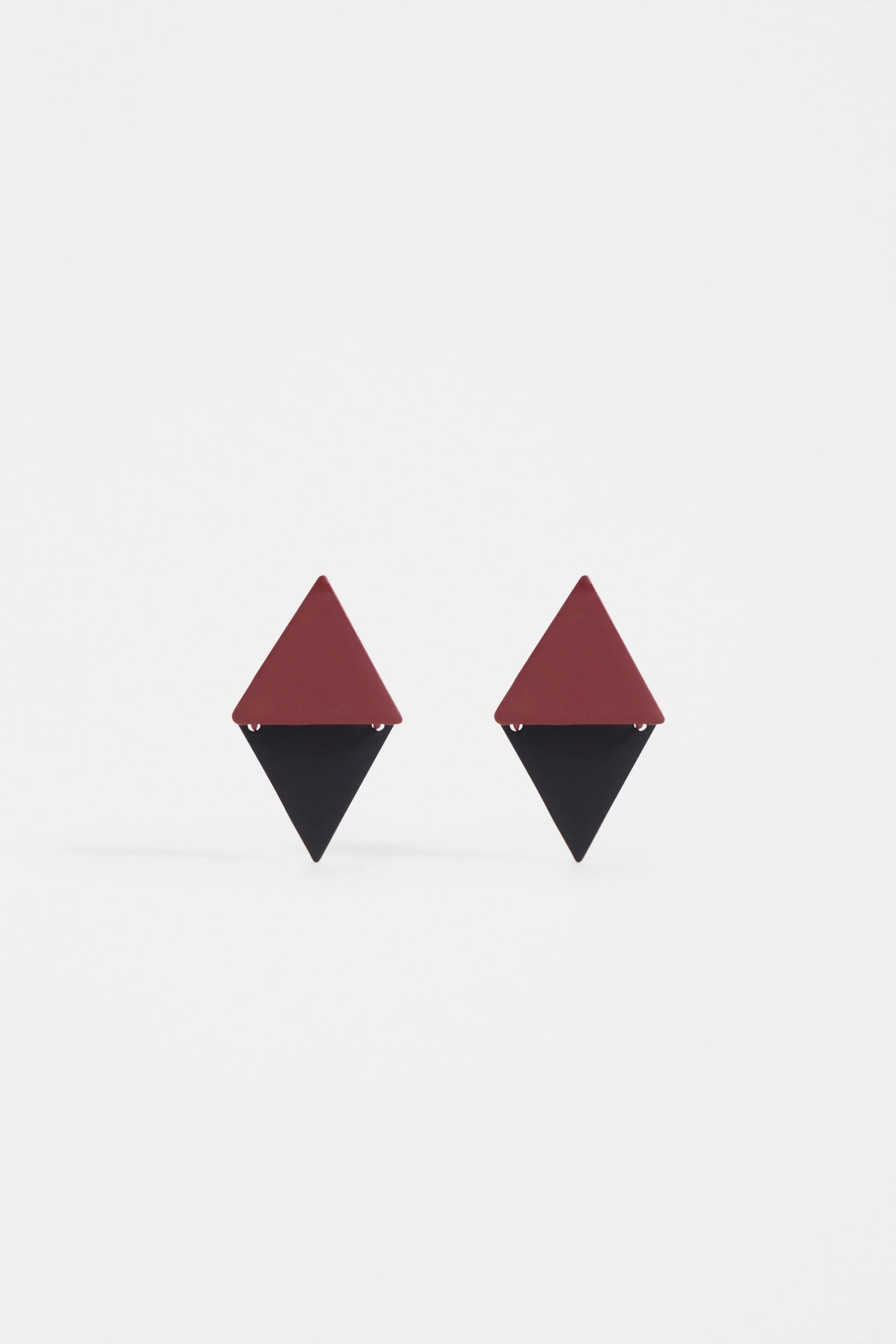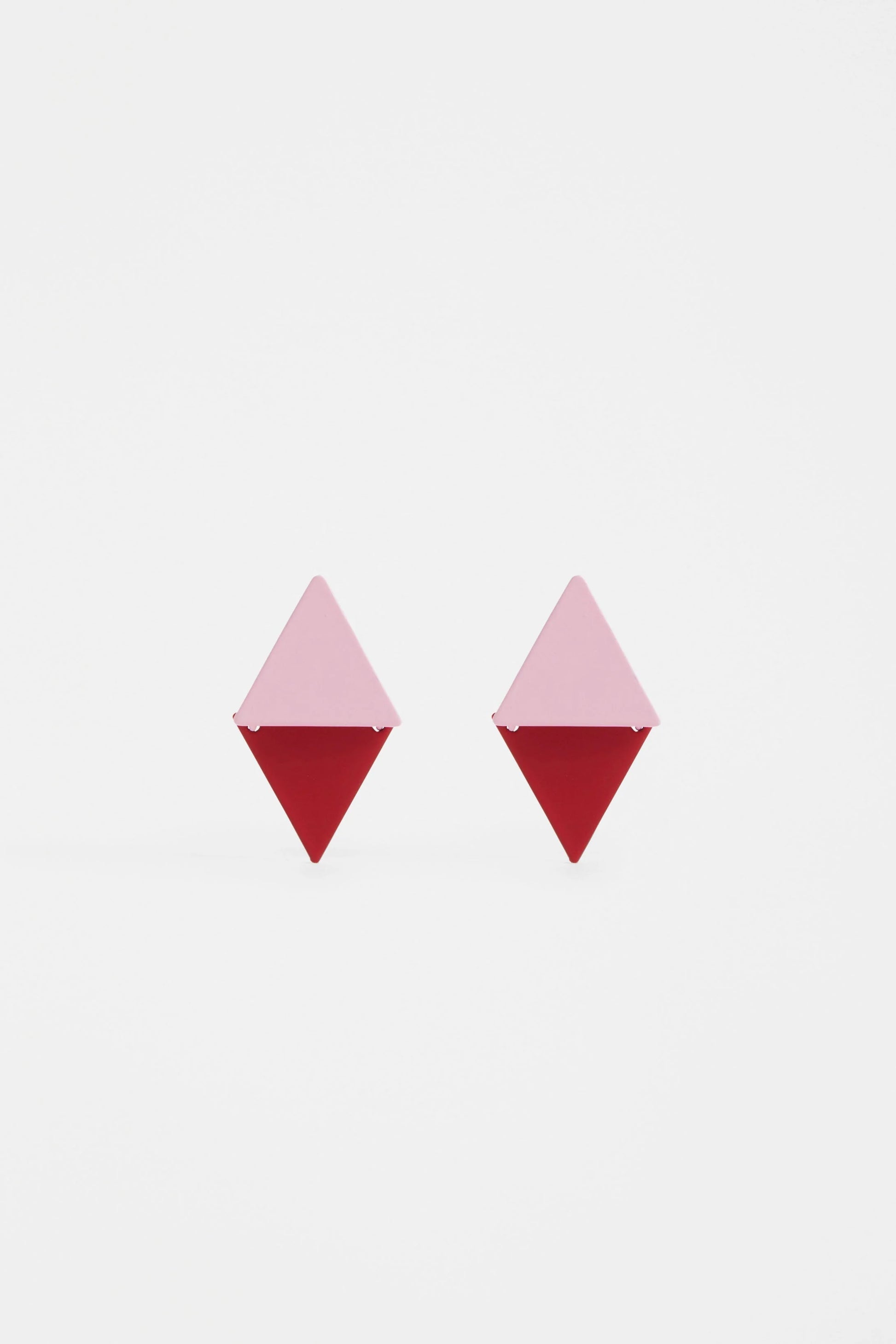 The Tri Stud Earring is a set of triangle shapes connected to form a diamond. Contrasting colours offer mid century charm. Crafted from rubberised metal this soft material gives the piece its vivid matte hue. These earrings have a standard titanium post with brass butterfly backing. Offered three playful colourways: Electric Green, Maple, and Shell Pink.