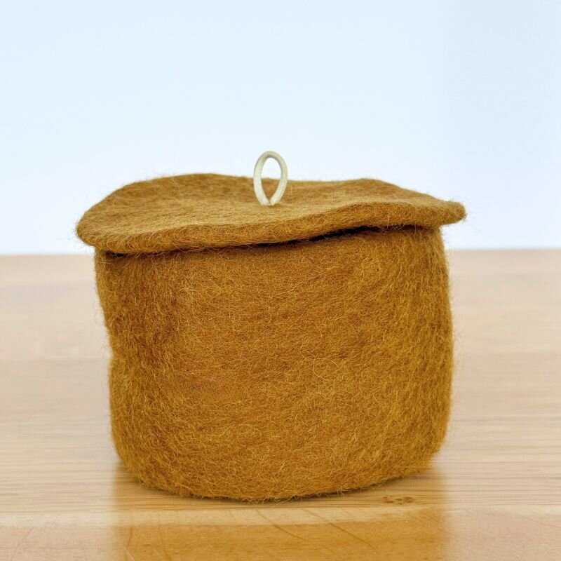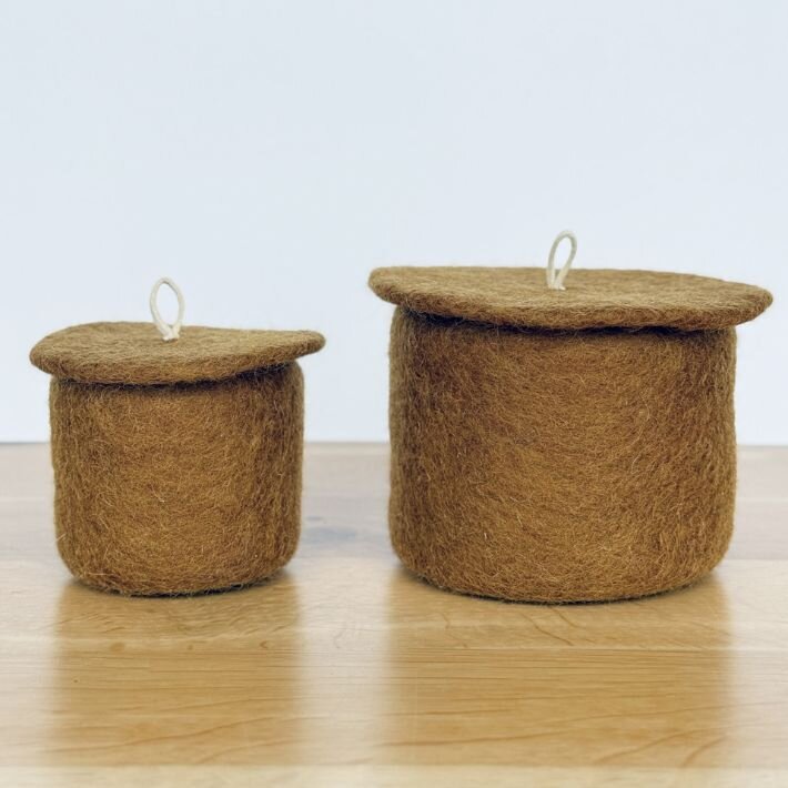 Add a natural touch to your bedside table or desk with these handcrafted felt pots. Perfect for storing jewellery, earbuds or tiny treasures. Each includes a lid with leather loop detail.
