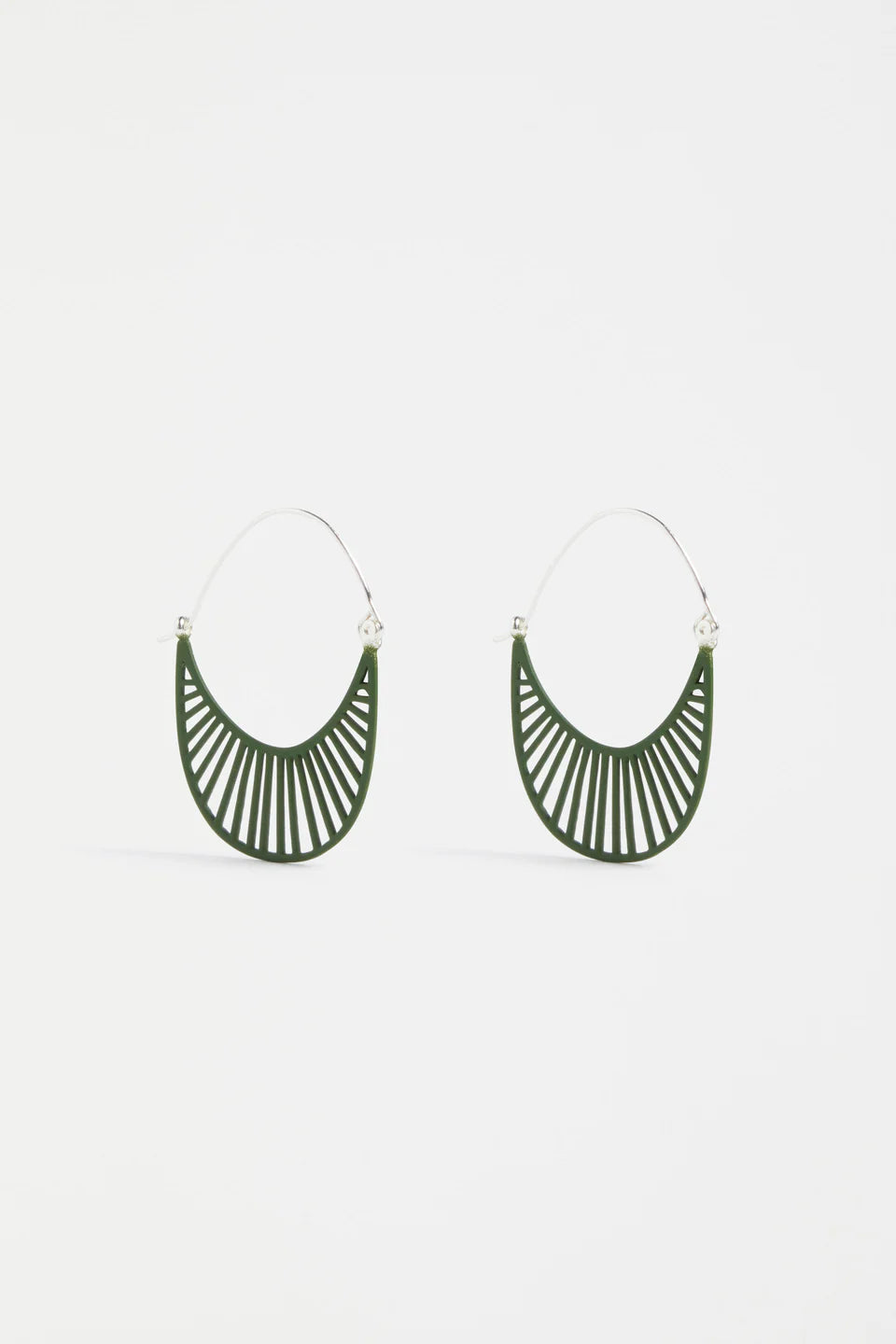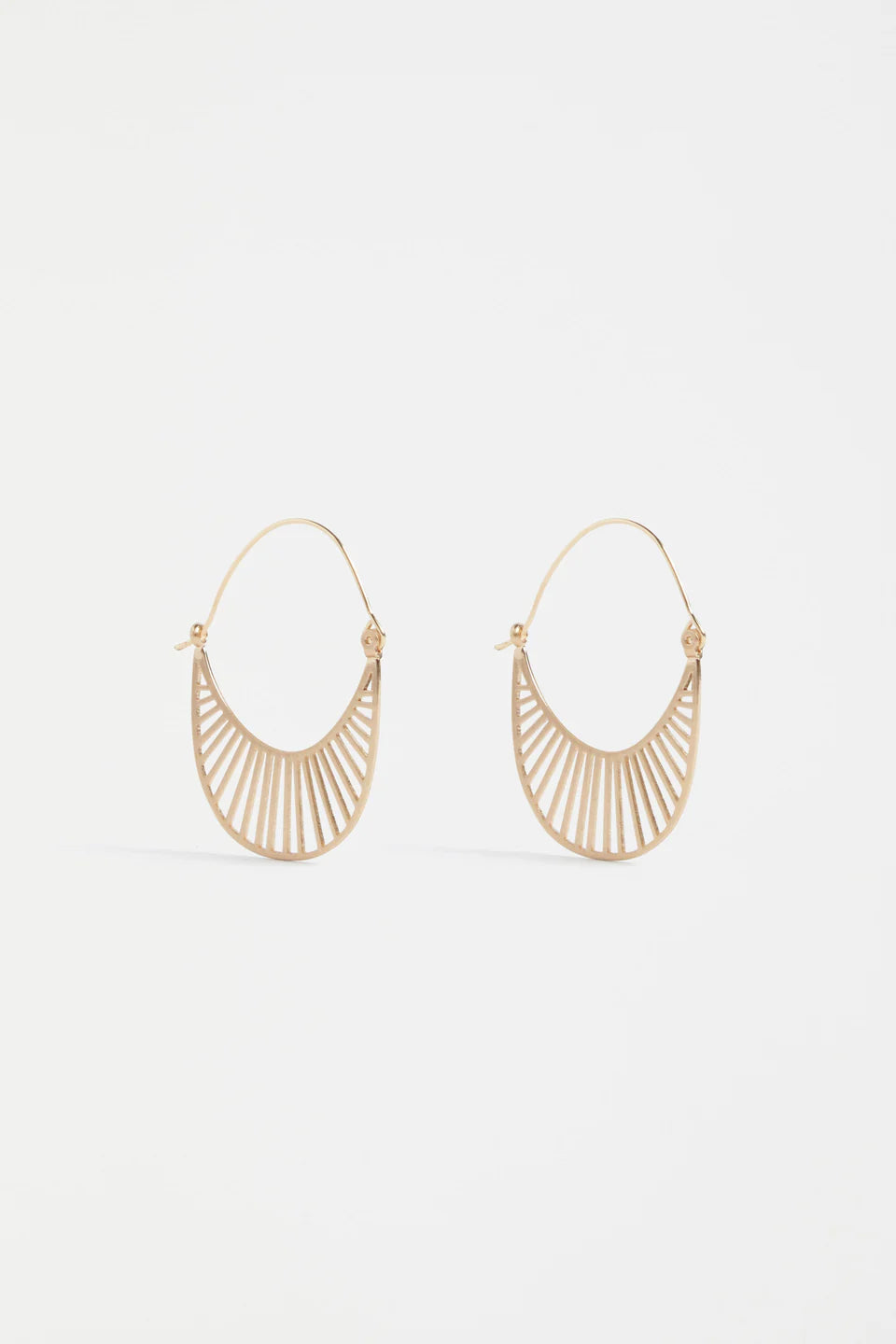A small yet striking hoop with a sun-ray cut-out design. The Solsken Small Hoop offers subtle texture and shine with every turn, this lightweight style is perfect for adding an effortless touch of character. With its hinged backing, it's an easy-to-wear daily piece that doesn’t require second thoughts. Just slip them on and go. Crafted in classic Gold, Silver, or Green Moss.