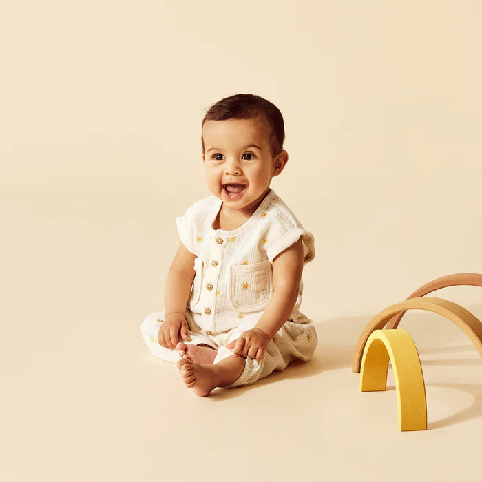 Get ready to keep your little one stylish and comfortable this summer with our organic cotton crinkle growsuit. This lightweight and breezy outfit features an all over embroidery for a charming touch. The roomy fit and functional patch pockets make it perfect for babies and kids. And with a mock wood button front and snaps at the crotch for easy nappy changes, it's a must-have for any parent.